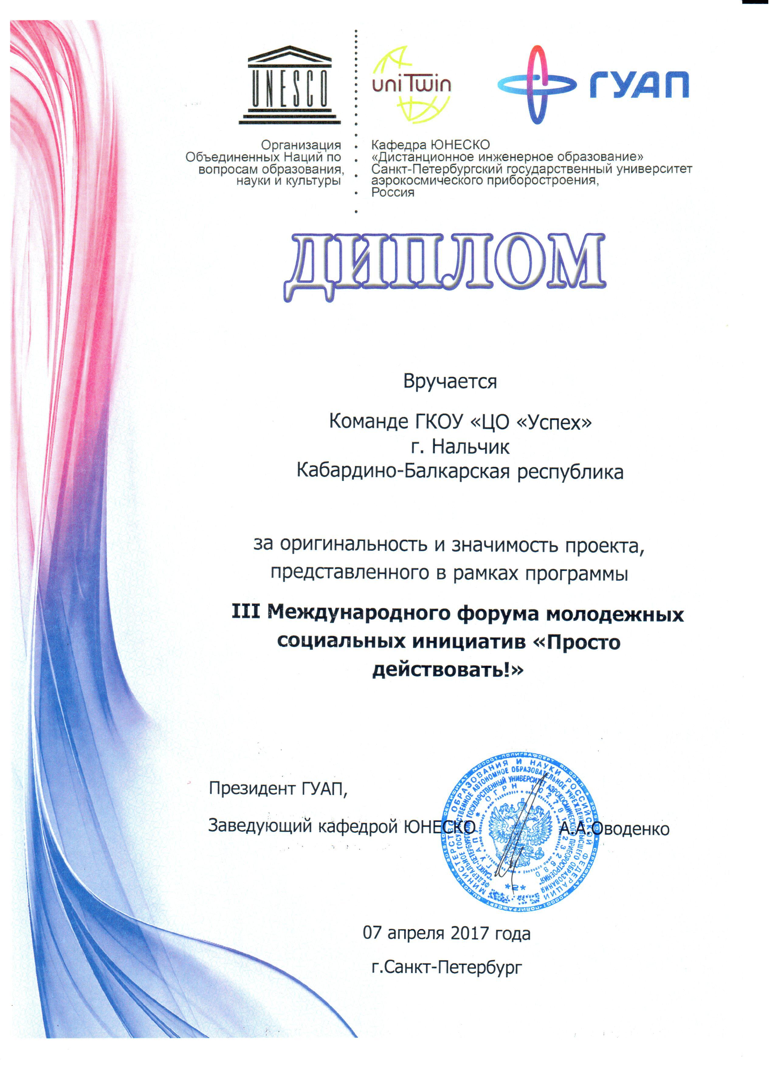 По результатам экспертной оценки жюри Международного форума молодежных социальных инициатив команда Центра образования «Успех» отмечена дипломом
