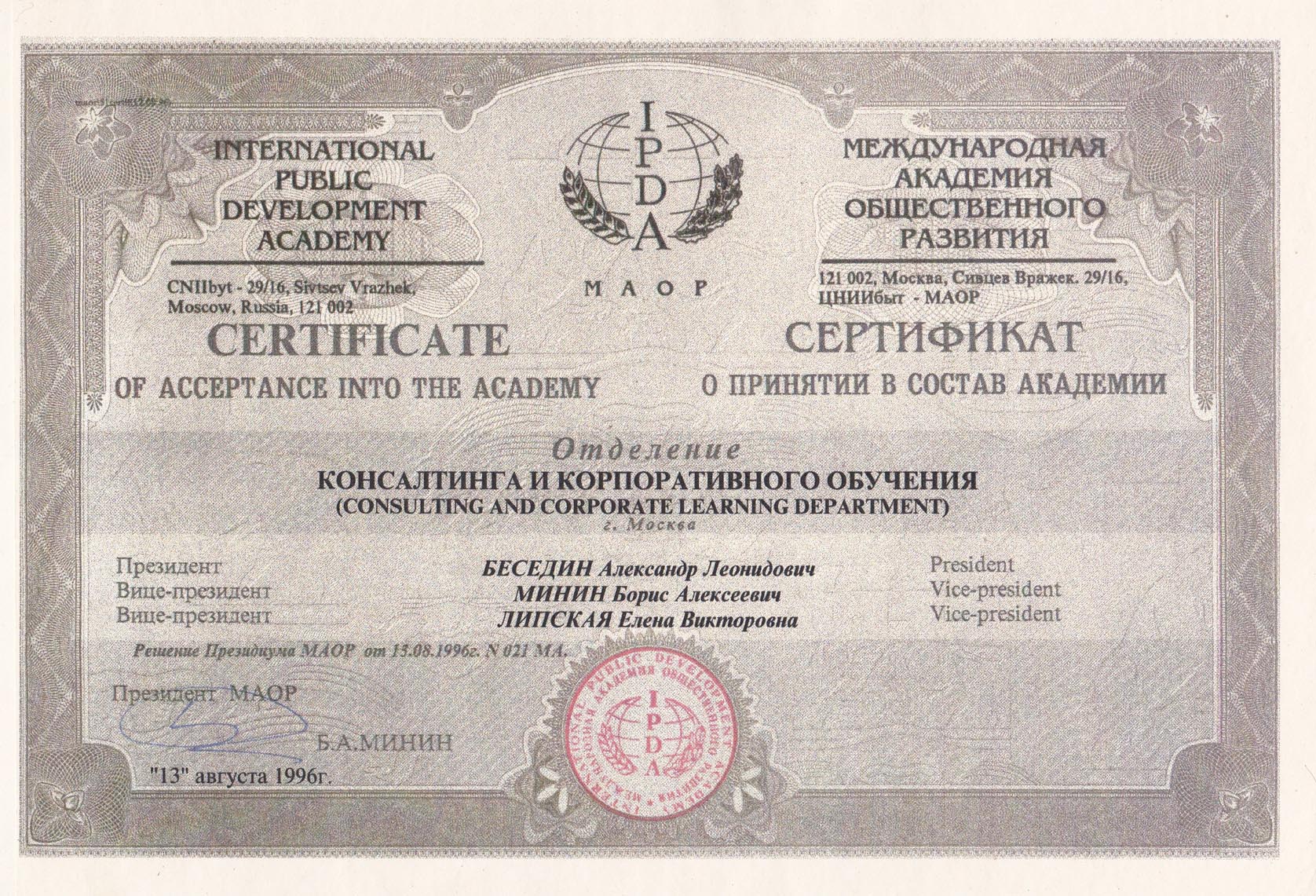 Президента Отделения консалтинга и корпоративного обучения МАОР,